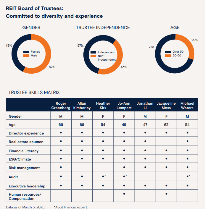 405 Diversity and Equal Opportunity 405-1 | Indicators of diversity monitored and recorded in 2024: Board of Trustee members: 2024 Sustainability Report page 7. Gender - Female: 43%. - Male: 57%. Age Group - Under 30: 0%. - 30-50: 29%. - Over 50: 71%. Ethnically Diverse - 14%. Executives and other Employees: 2024 Sustainability Report page 17, Who Makes Up Our Team pages 1 to 2. For indicators and links to indicators of diversity monitored and recorded in previous years see 2023 ESG Report page 70. Workplace Harassment & Discrimination Policy: here. Diversity Policy: here. Advancing our commitment to acceptance and inclusion: 2023 ESG Report page 13 and Featured Story. Diversity of the Board of Trustees and senior management: Management Information Circular page 28 to 29. (Material topic: Diversity and inclusion). |